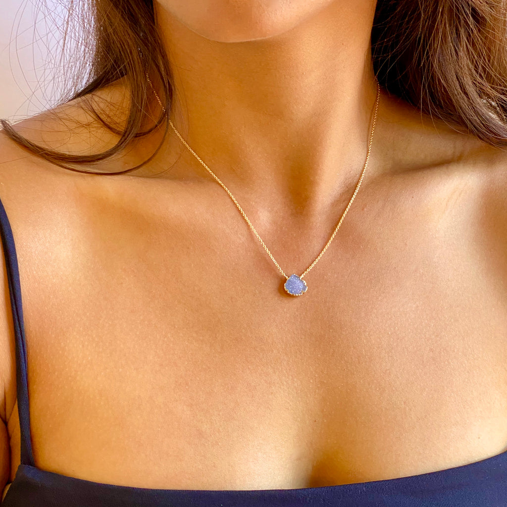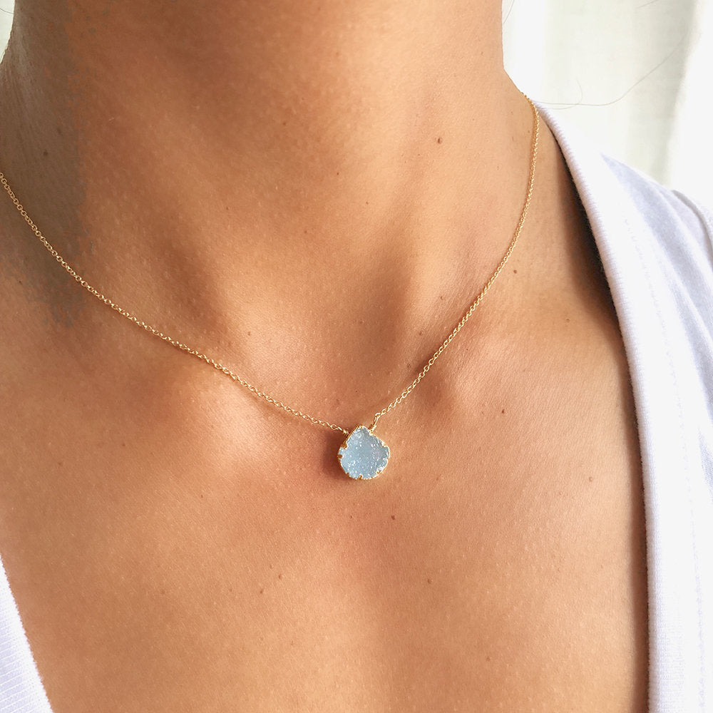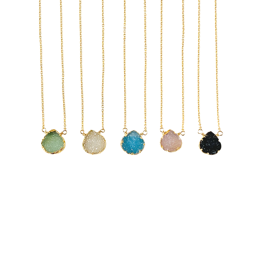 Our teardrop druzy pendant necklace is a dainty piece for layering or wearing alone. Available in aqua, white, blue, pink & black.