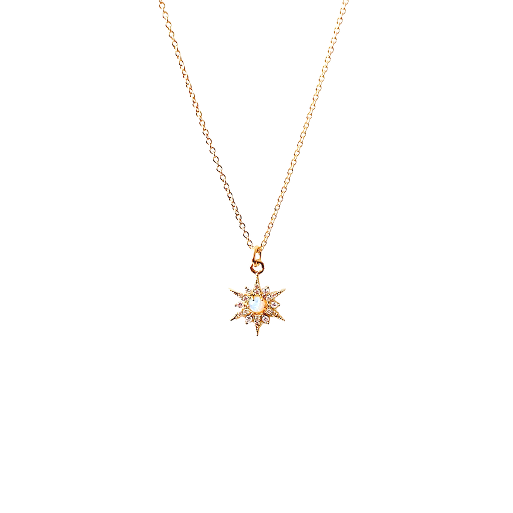 This gorgeous star pendant features an opal center with radiating cubic zirconia and gold. It's destined to be an eye catcher.