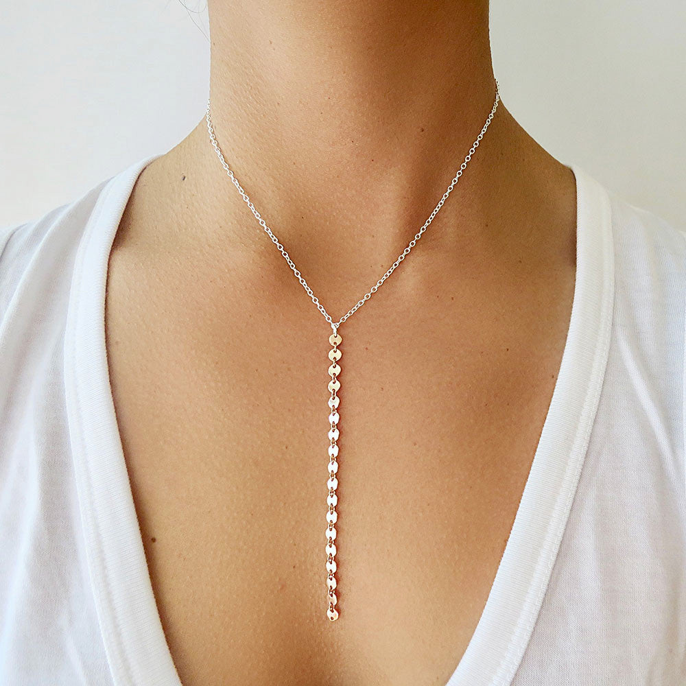 Add effortless elegance to your look with this lariat, dangling necklace featuring a series of flat, coin-shaped pieces. Its sleek, minimal design makes it perfect for layering — pair it with shorter necklaces or a modern choker for a chic, curated style.