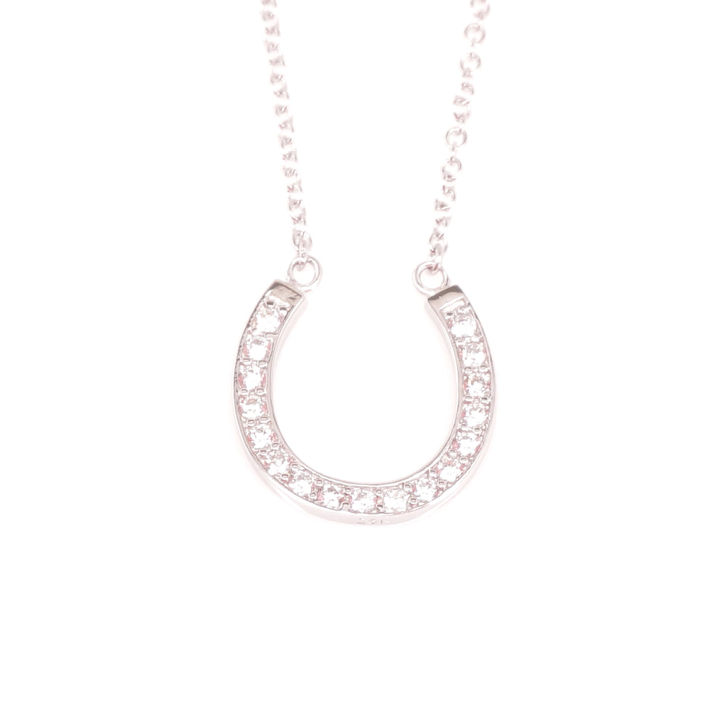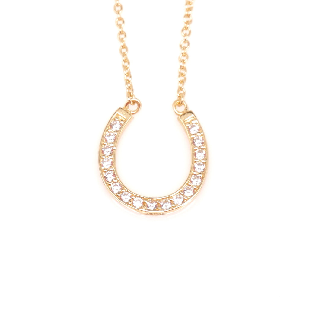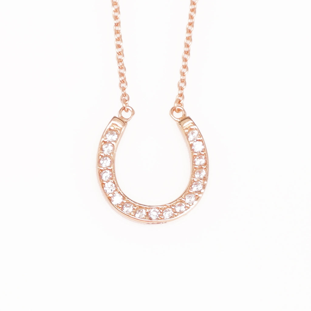 This cute horseshoe pendant is lined with Cubic Zirconia stones. The pendant is attached to the chain at the tops of the horseshoe. Available in sterling silver, rose gold, and gold.