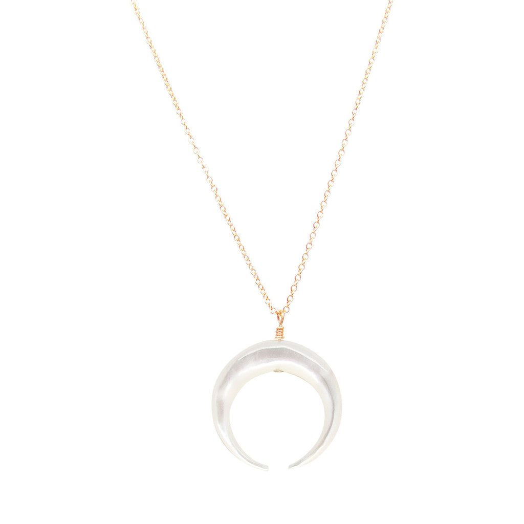 This necklace features a mother of pearl double crescent pendant on 14k gold-filled delicate chain. These pendants are one of a kind and are hand carved in Bali, Indonesia. Choose from two sizes.
