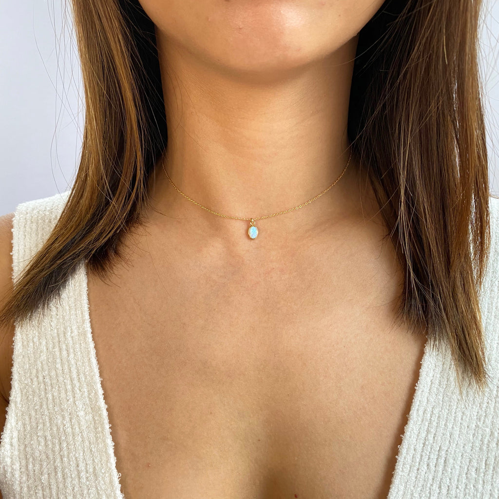 This petite opal pendant surrounded by a gold bezel is truly mesmerizing. Pair with the cubic zirconia charm add-on for an even more dramatic look.