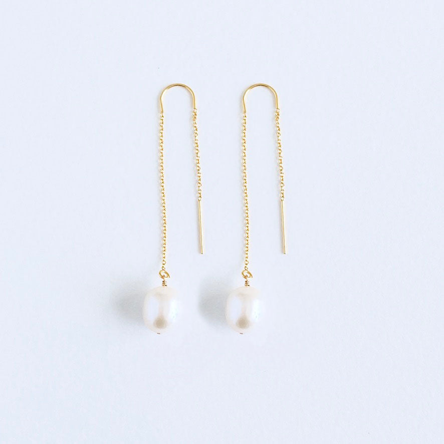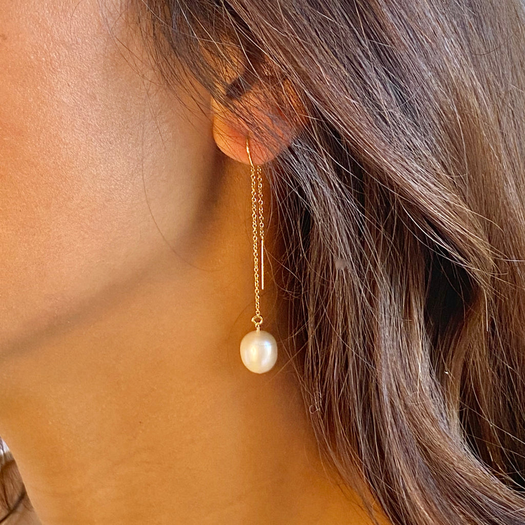 These beautiful pearl threader earrings add the perfect touch of glam. Features freshwater pearls and 14kt gold fill.