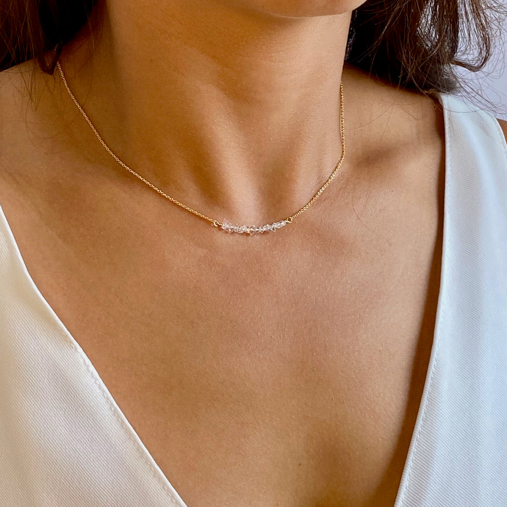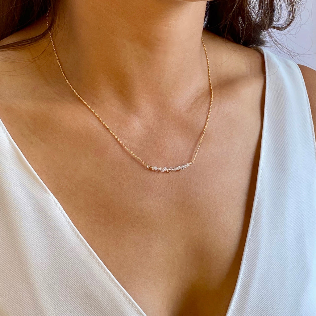 This petite Herkimer Diamond necklace features multiple gems of varying shapes and sizes placed along a horizontal bar. Available in rose gold filled, gold filled and sterling silver and in 16", 18" or 20" lengths.